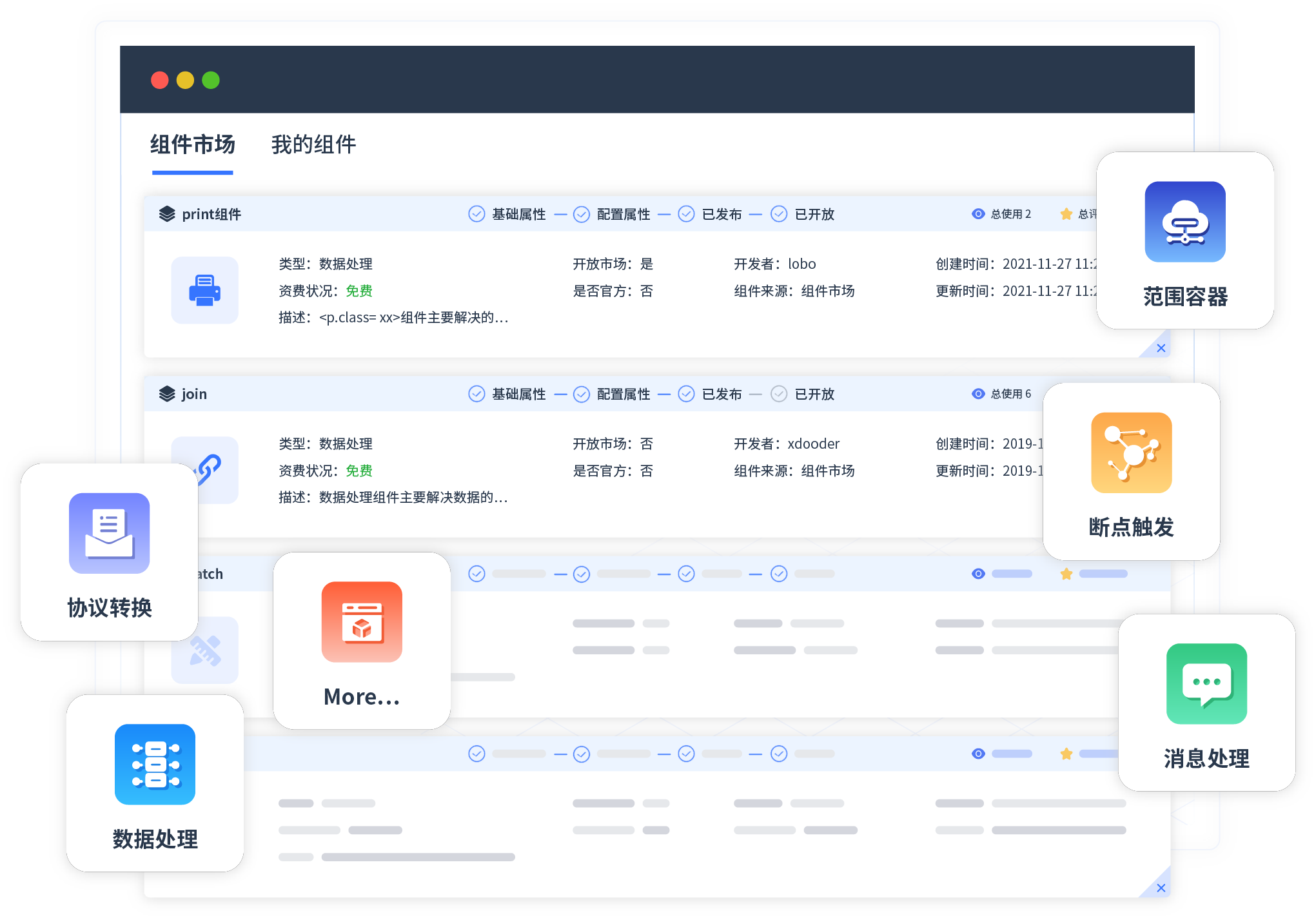 针对集成场景,,,CGPAY钱包提供组件市场,,,,例如协议转换、、消息处理、、文件操作等。。。。除平台提供的组件外,,客户可以自定义所需组件。。。
