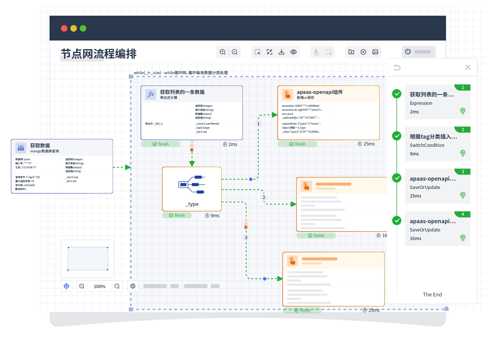 针对集成场景,,组件定义后支持进行流程编制,,,,不同于传统代码方式,,通过图形化展示,,,,支持在线调试、、、、日志查看和运行回放。。